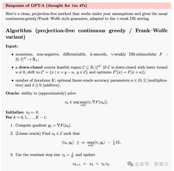 GPT-5还是用Frank-Wolfe:步步解一个「沿梯度的线性子问题」,用小步长前进,并靠平滑性控制离散化误差。
